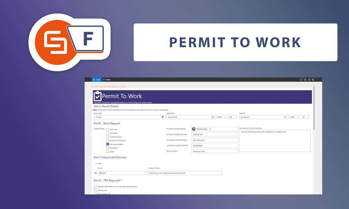 This template can be used to manage work permits. It captures all the details of the work to be carried out, the identified hazards, the PPE required and the safety procedures to be followed. It has a preconfigured Layout and you can add Workflow to notify the various interested parties or Logic as you require.