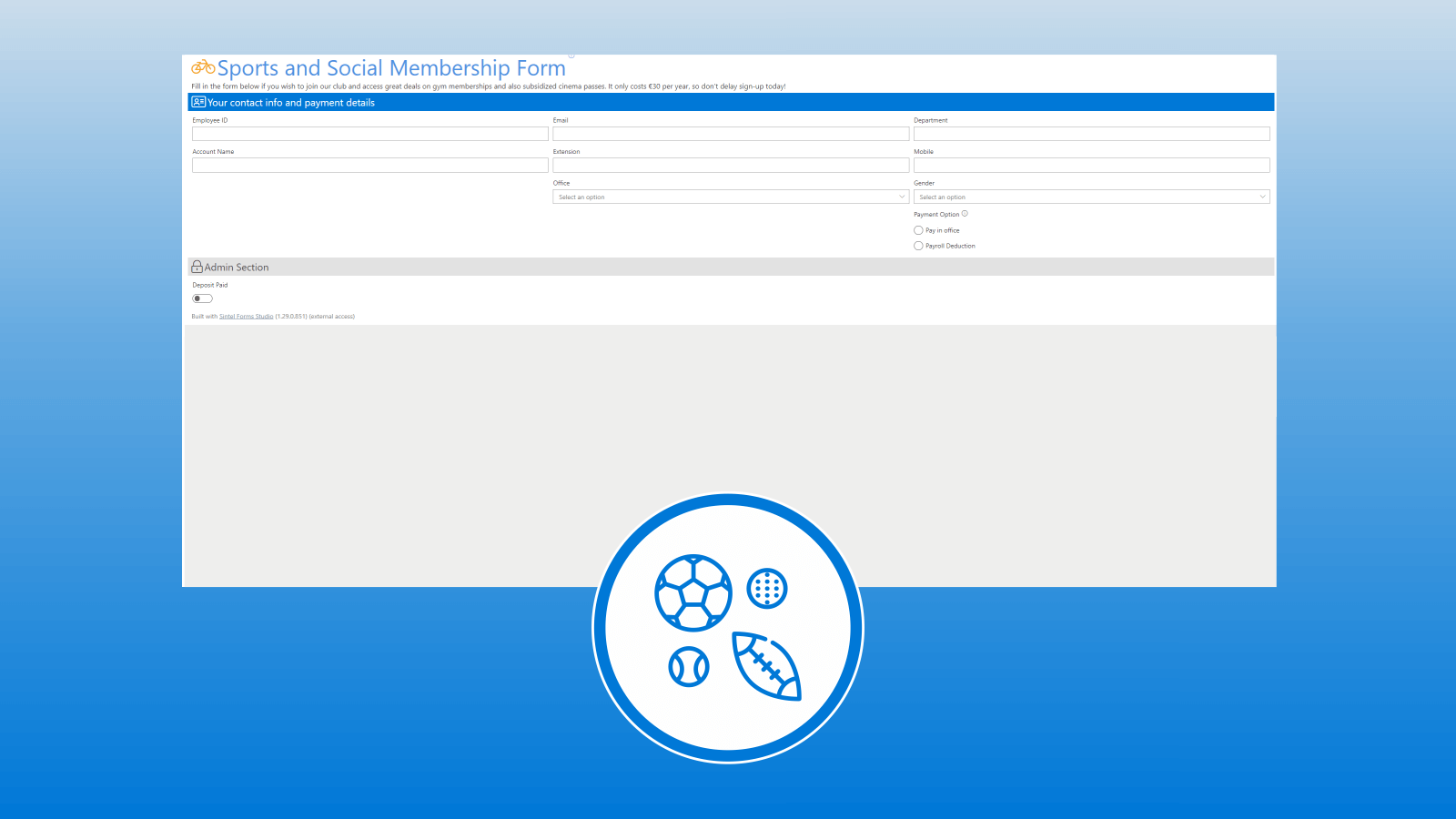 This template can be used to enable employees join a Sports and Social club. It captures all the contact details of the person (including auto setting their name when they create the form). It contains Workflow to send rich email notifications to the submitter as the form is processed and logic to handle mandatory fields.