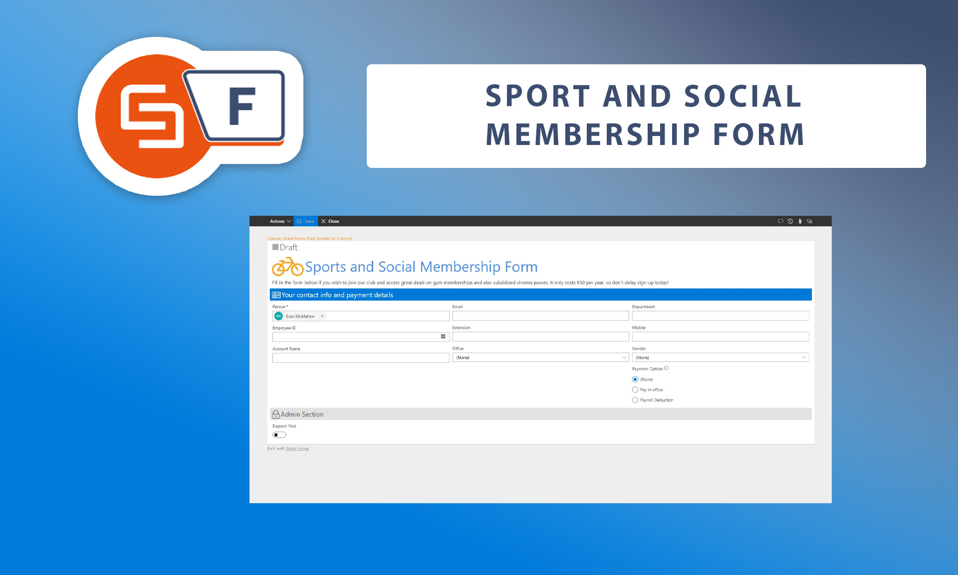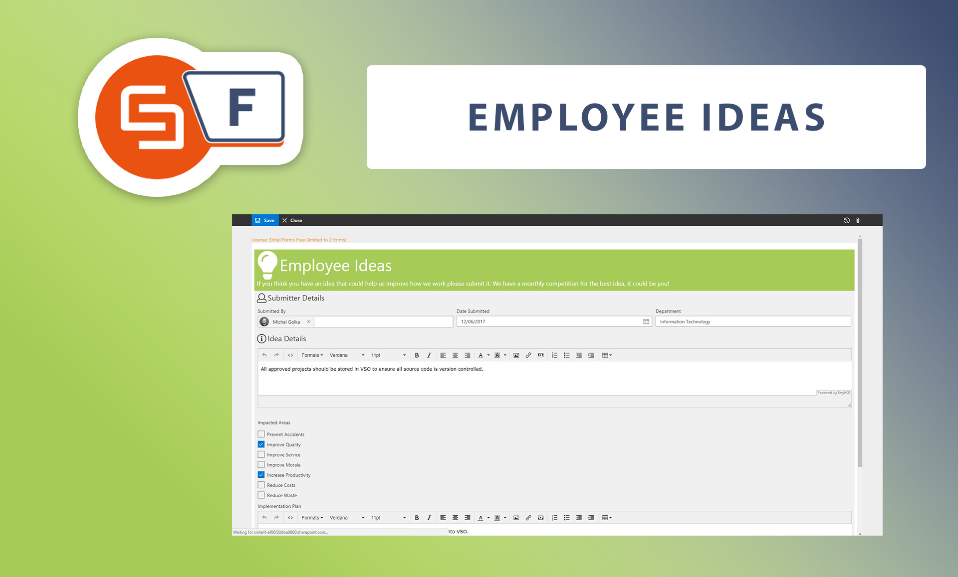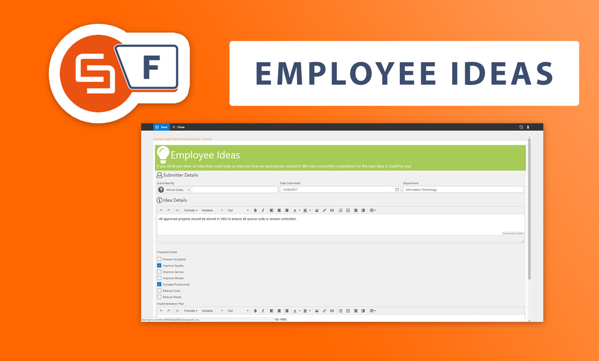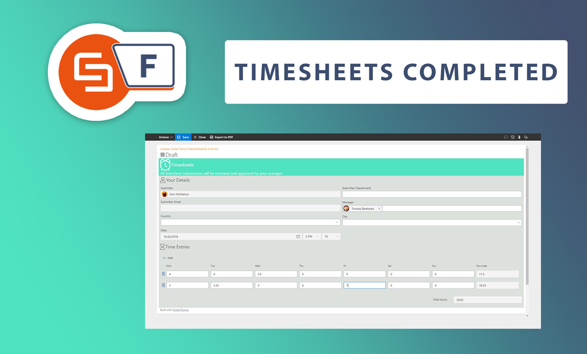 Use this template to enable users submit timesheets. It contains a layout, workflow and some logic that provides auto setting the date. It also contains a default value that sets the Submitter and their email along with cascading dropdowns linking a Country and City. This is a good example of the use of workflow and Logic.