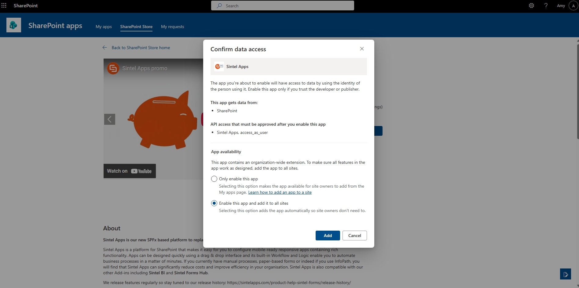 Click: Enable this app and add it to all sites, and then click Add.