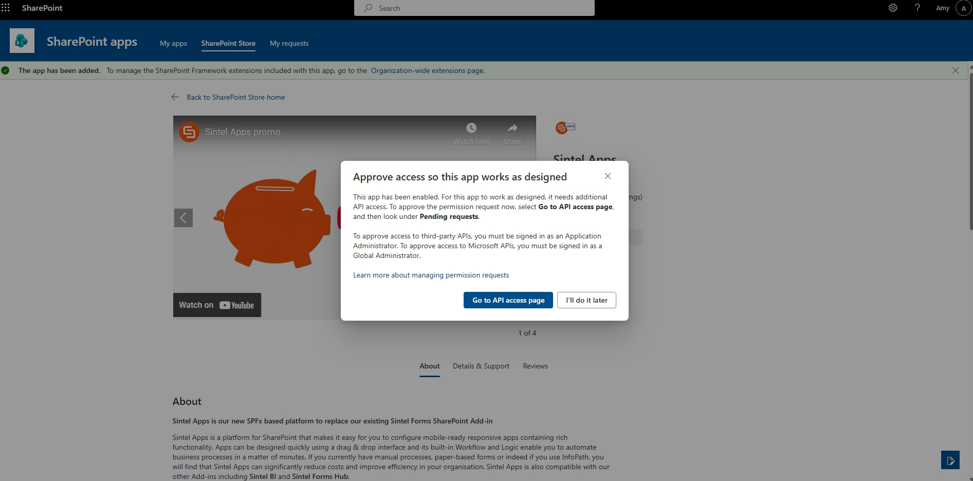 Sintel Apps has now been successfully added to your tenant and is ready for use. Site owners can start using its features across their sites.