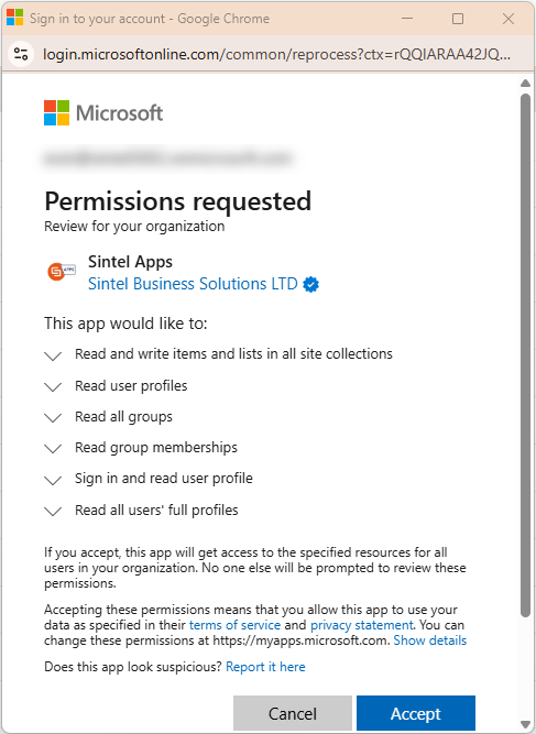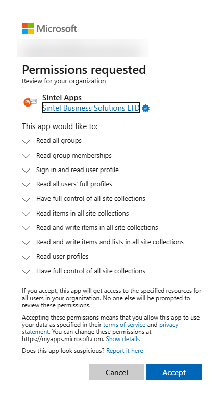 Another pop-up will appear, outlining what the app will access: such as groups, memberships, permissions, and site collections.