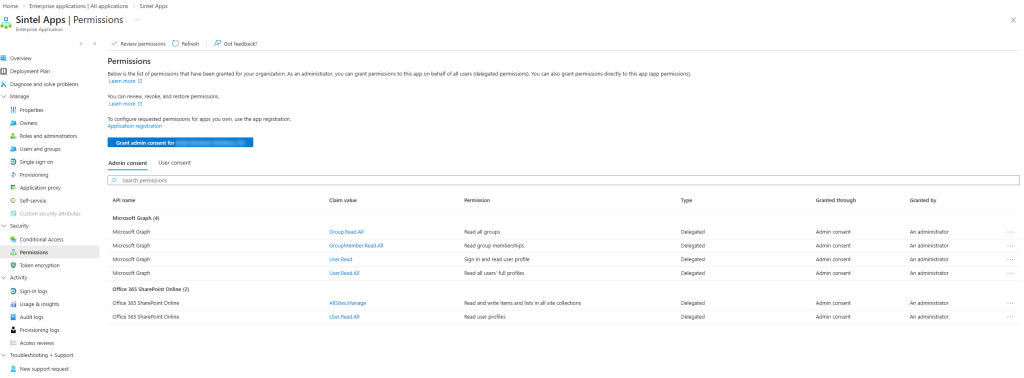 The process you are following will create an Enterprise application in Azure named “Sintel Apps” and this application will be granted Delegated permissions to Microsoft Graph and SharePoint Online. This means that the application will essentially inherit the permissions of the user who is using it and this ensures that the application can only access data the the users has access to.