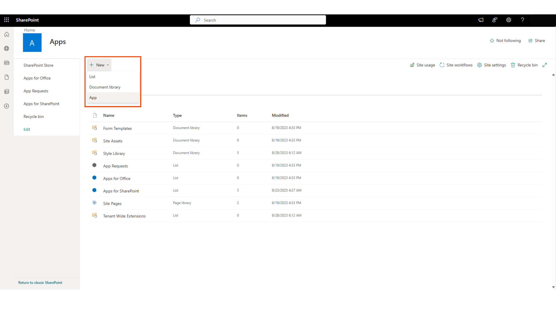 Return to your SharePoint site’s Site contents page.