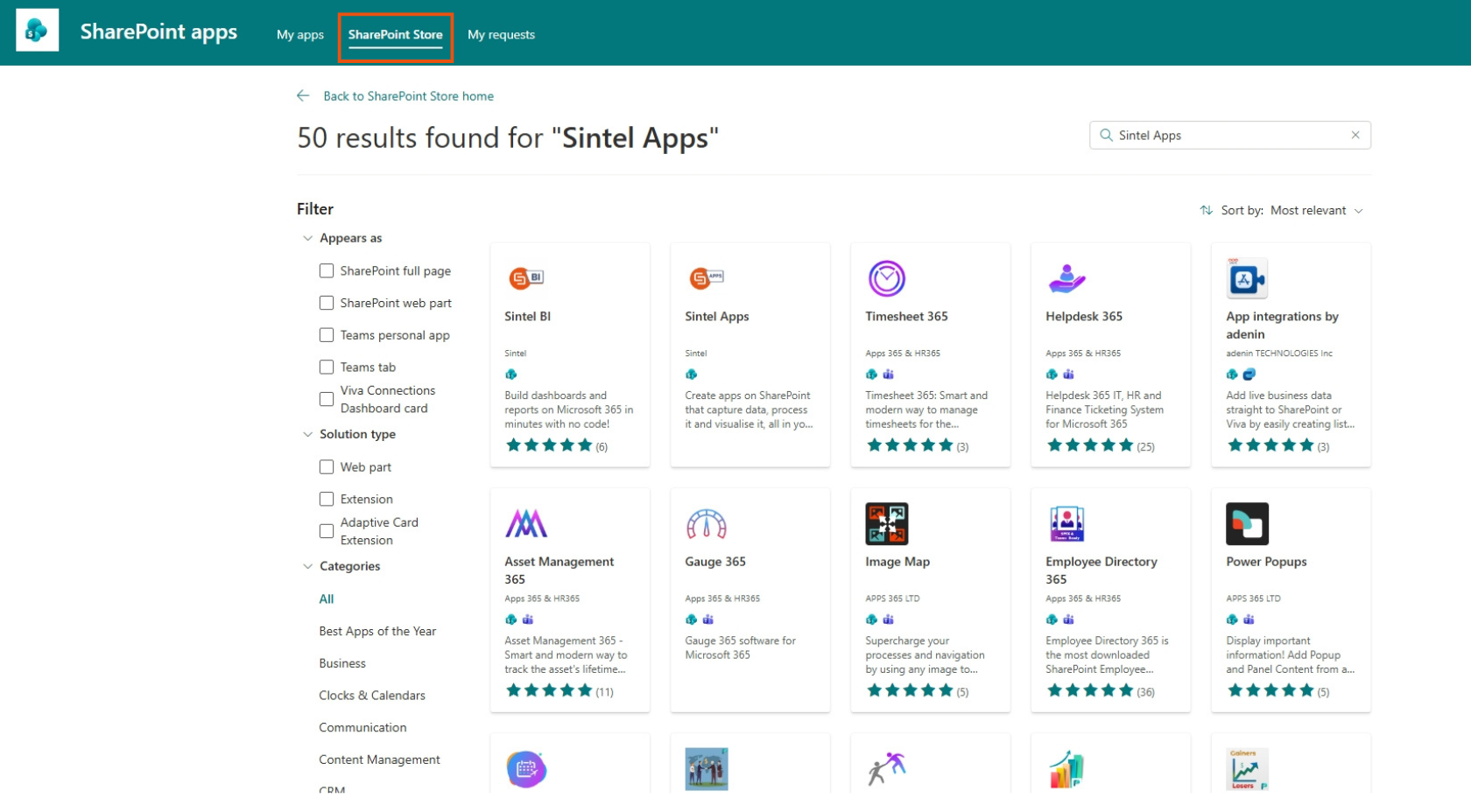 - In the SharePoint Store, search for “Sintel Apps”.
