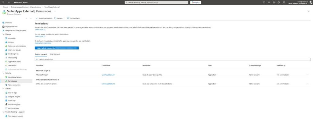 The process you are following will create an Enterprise application in Azure named “Sintel Apps External” and this application will be granted Application permissions to Microsoft Graph and SharePoint Online.
