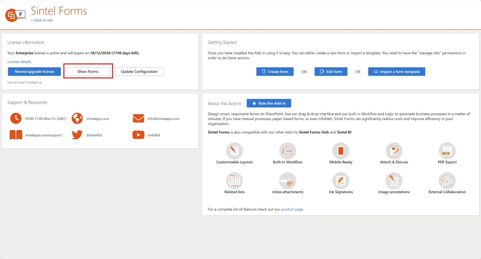 The Show Forms view displays all sites which Sintel Forms is configured on and how many forms are on those sites.