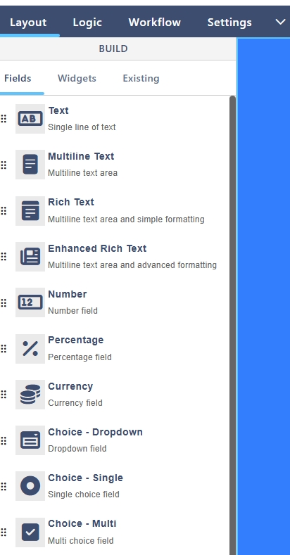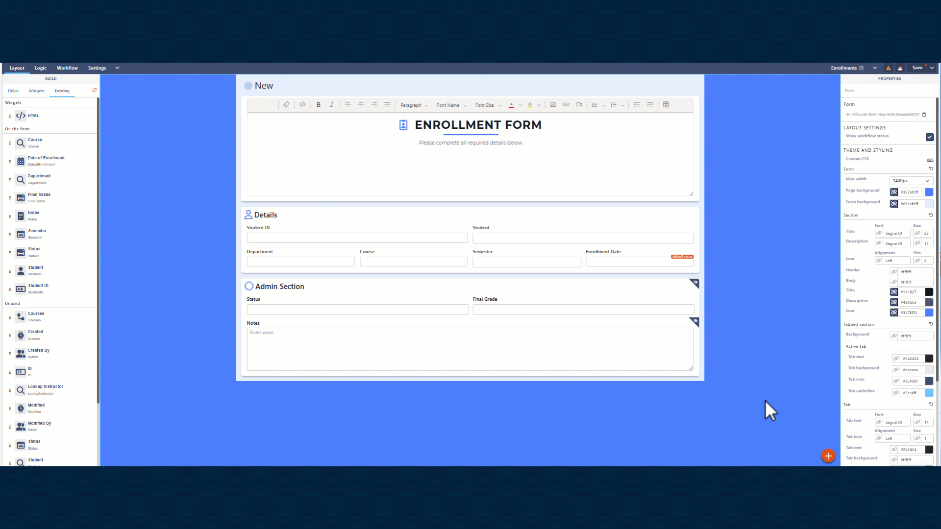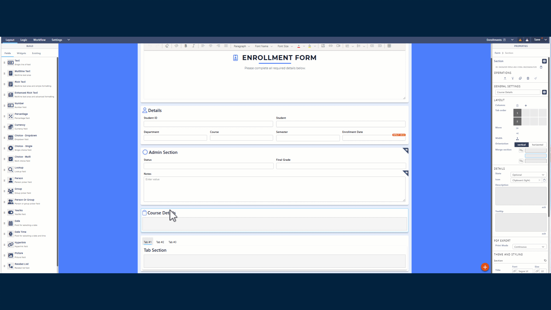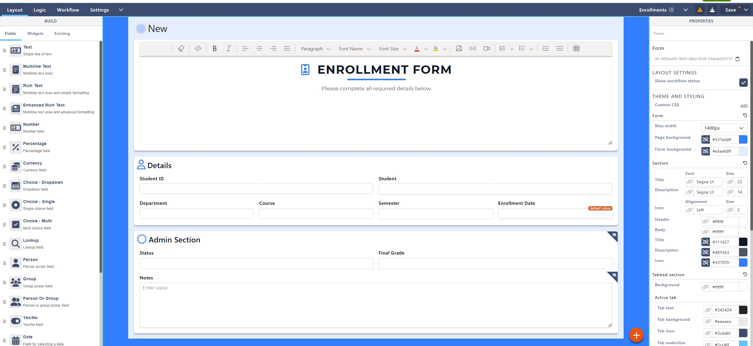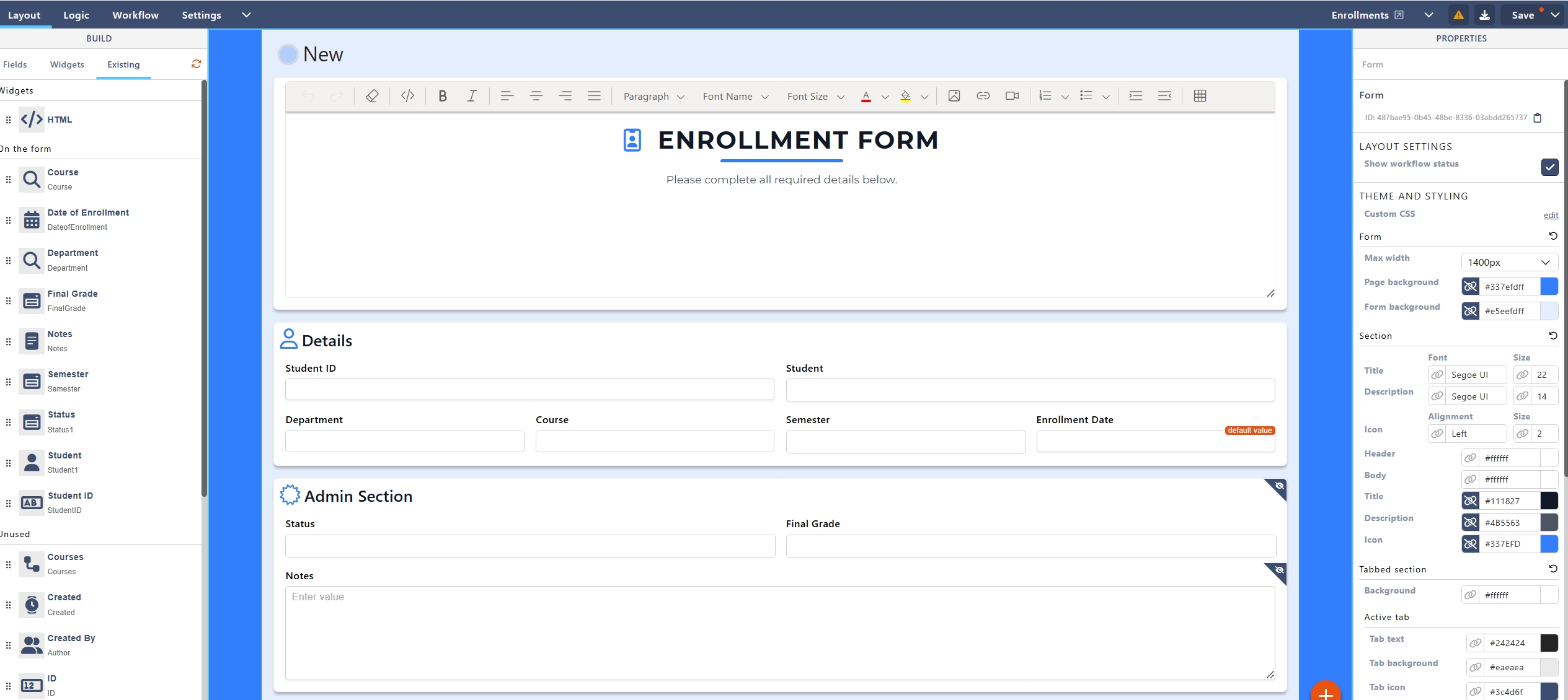 The Layout tab focuses entirely on what users see and interact with when completing a form.