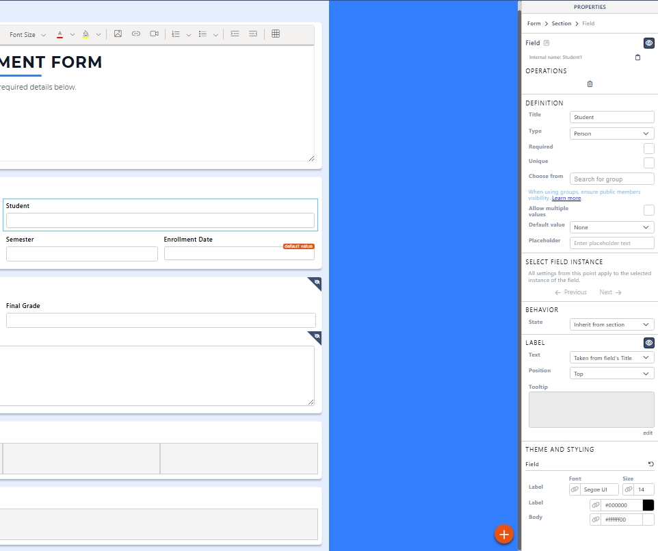 When a form is created, a default section (e.g. Section #1) is added automatically.