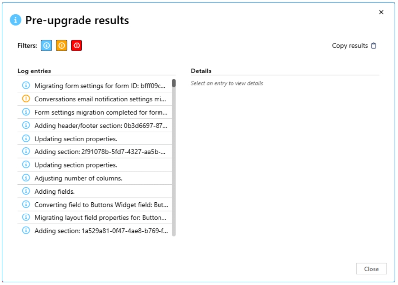The upgrade wizard will run a pre-upgrade check which reviews the entire form configuration and generates a report.